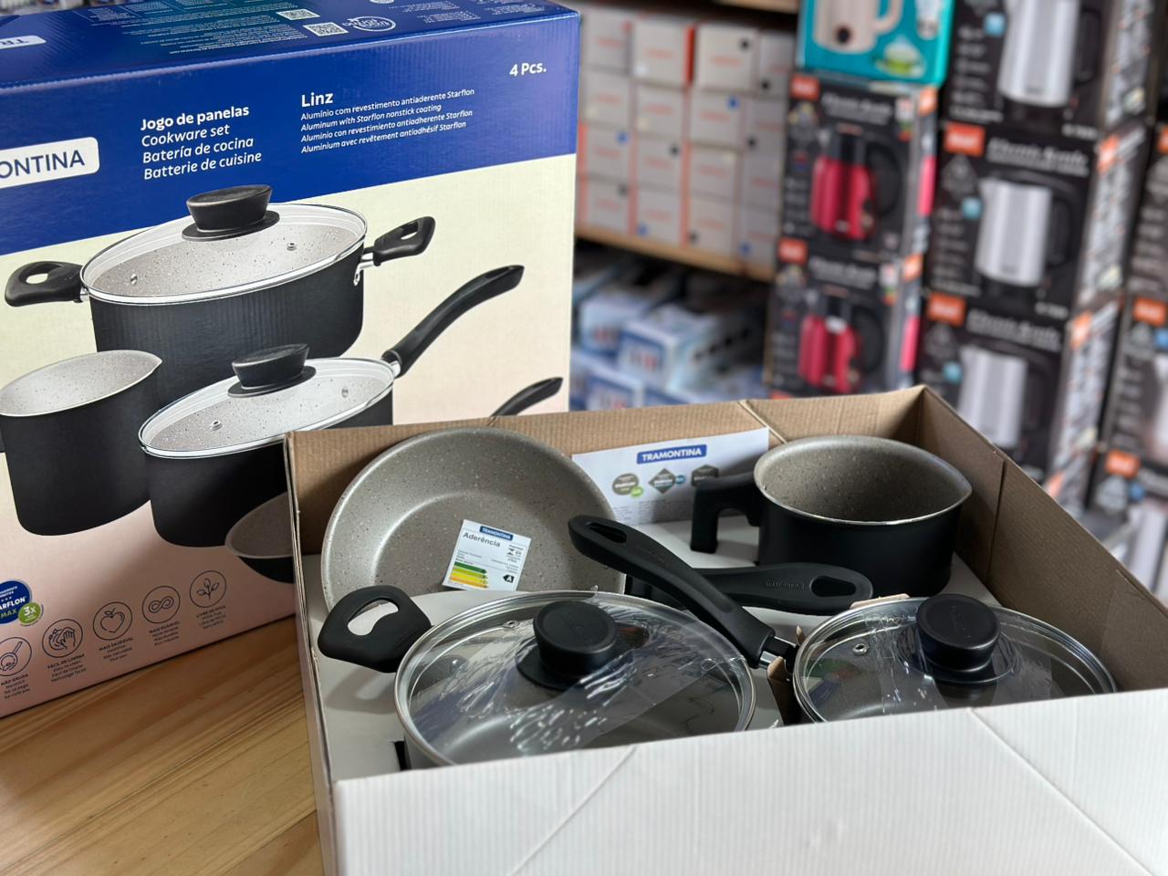 Set de 4 ollas Tramontina de acero inoxidable, duraderas y con distribución uniforme de calor. Ideal para cocinar con eficiencia y fácil limpieza.
