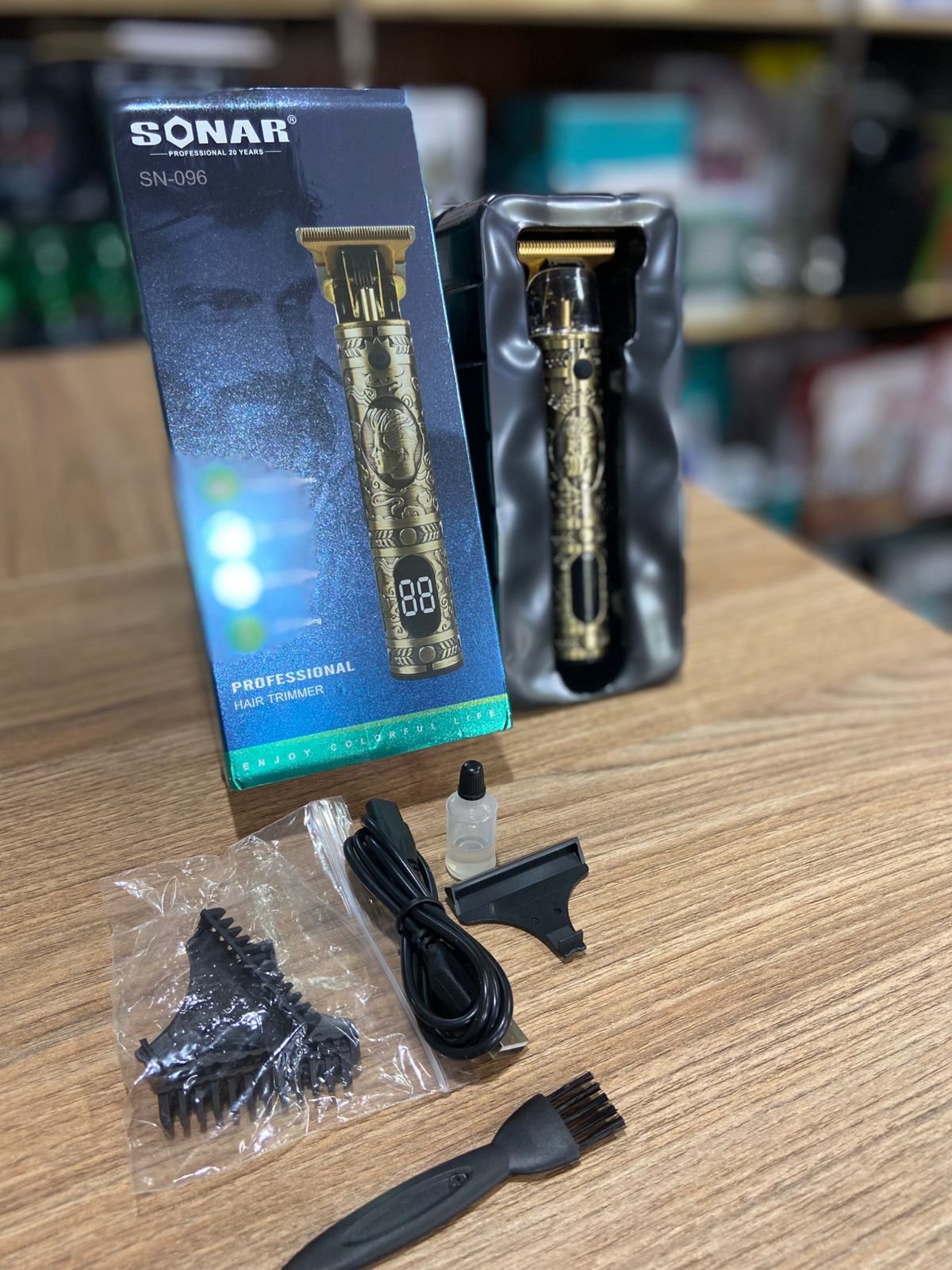 Recortadora inalámbrica Sonar SN-096 para detalles y contornos. Motor potente, cuchillas T de acero inoxidable, pantalla LED y diseño vintage. Incluye peines, aceite y cepillo. Ideal para afeitado en seco y precisión.